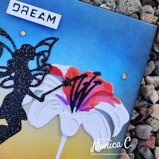 I created a cardpanel out of white cardstock and using Memento inks and a mini blending tool, I created a background to look like a sunrise. I cut all the parts of the Altenew Craft-a-Flower lily die from Canson Watercolor paper and added a spot of color with my watercolor paints. The fairy is a Spellbinders die that I cut out of black glitter cardstock.